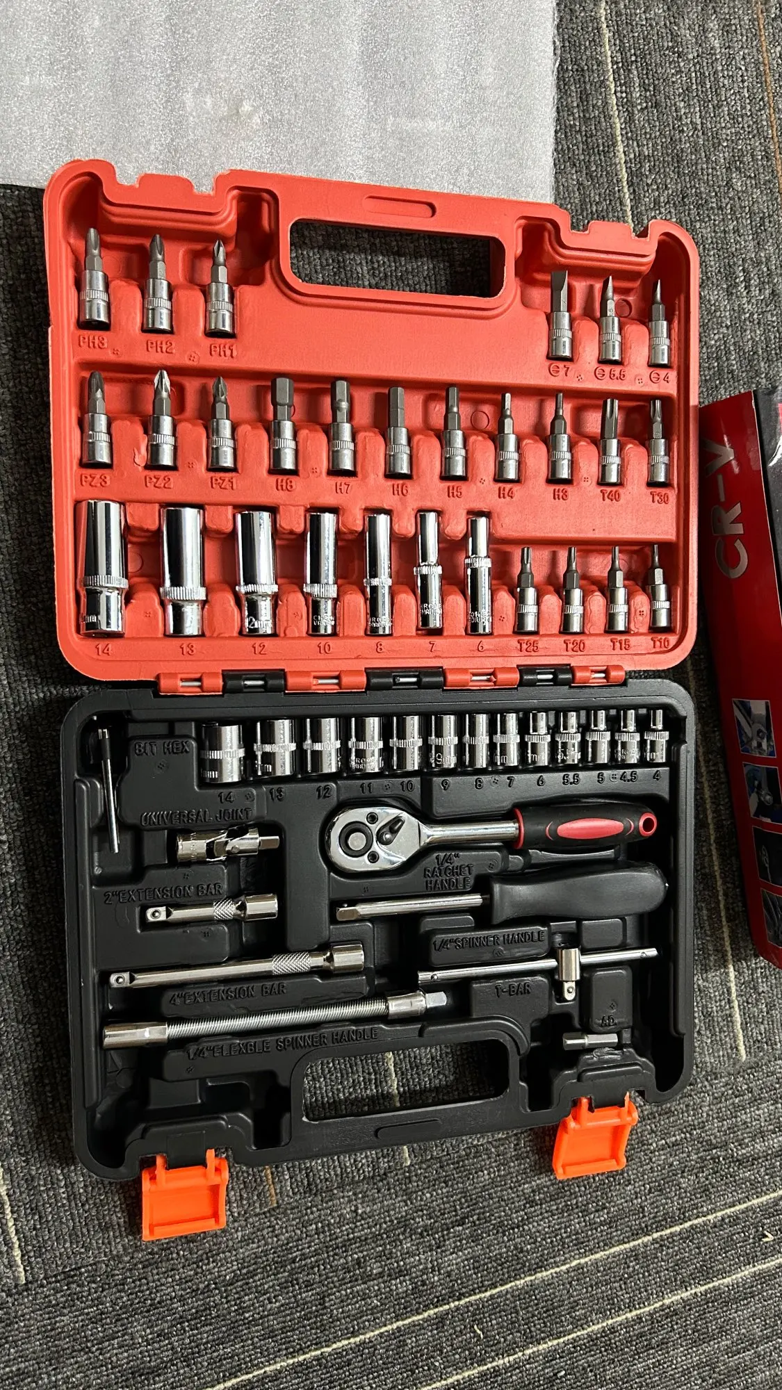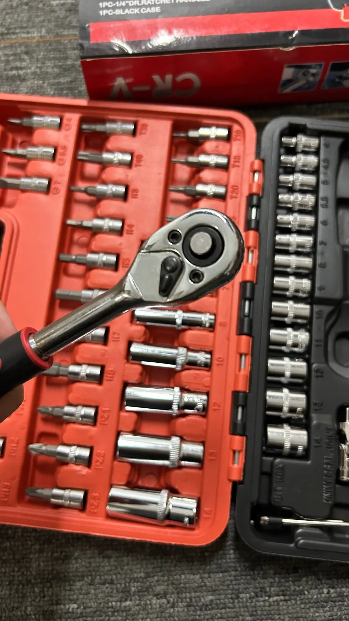 This is a very good household hardware tool. The material of the tool looks very solid and feels heavy and substantial when held in hand. A few days ago, my friend's car tire screws were a bit loose. I took this toolbox there. It had all kinds of sockets of different specifications, making it easy to match screws of different sizes. The ratchet wrench was particularly convenient to use, saving effort and being highly efficient. In just a few minutes, i checked and tightened all the screws of the four tires. My friend all praised this tool as being very practical. It's a versatile little assistant for both home and car maintenance.